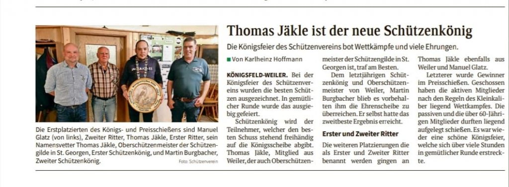 Bei der Königsfeier des Schützenvereins in Königsfeld-Weiler wurden die besten Schützen des Königs- und Preisschießens ausgezeichnet. Thomas Jäkle wurde neuer Schützenkönig, gefolgt von Manuel Glatz als Zweitem Ritter und seinem Namensvetter Thomas Jäkle als Erstem Ritter. Martin Burgbacher wurde zweiter Schützenkönig. Es war ein rundum gelungener Abend, an den wir uns gerne erinnern.