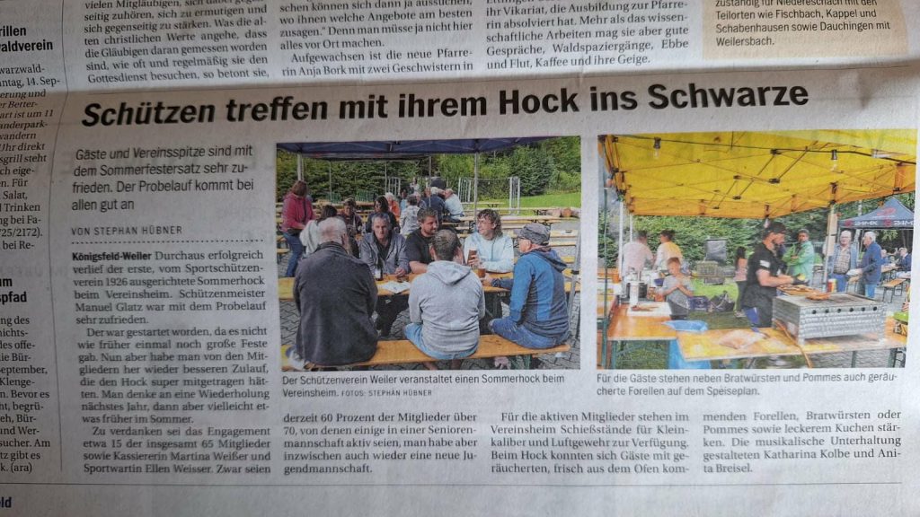 Beim Sommerhock des Schützenvereins Weiler herrschte beste Stimmung. Zahlreiche Mitglieder und Gäste nutzten die Gelegenheit, bei leckerem Essen, Musik und guten Gesprächen zusammenzukommen. Besonders beliebt waren die frisch zubereiteten Forellen sowie Bratwürste und Pommes. Der Verein zeigte sich sehr zufrieden mit der Resonanz und plant, das neue Format auch künftig fortzuführen.